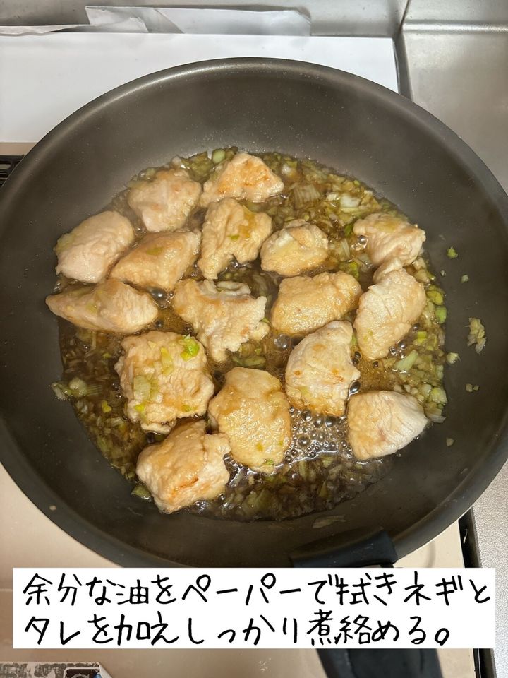 余分な油を拭き取り、長ネギと合わせておいたタレを加えてしっかり煮絡める。