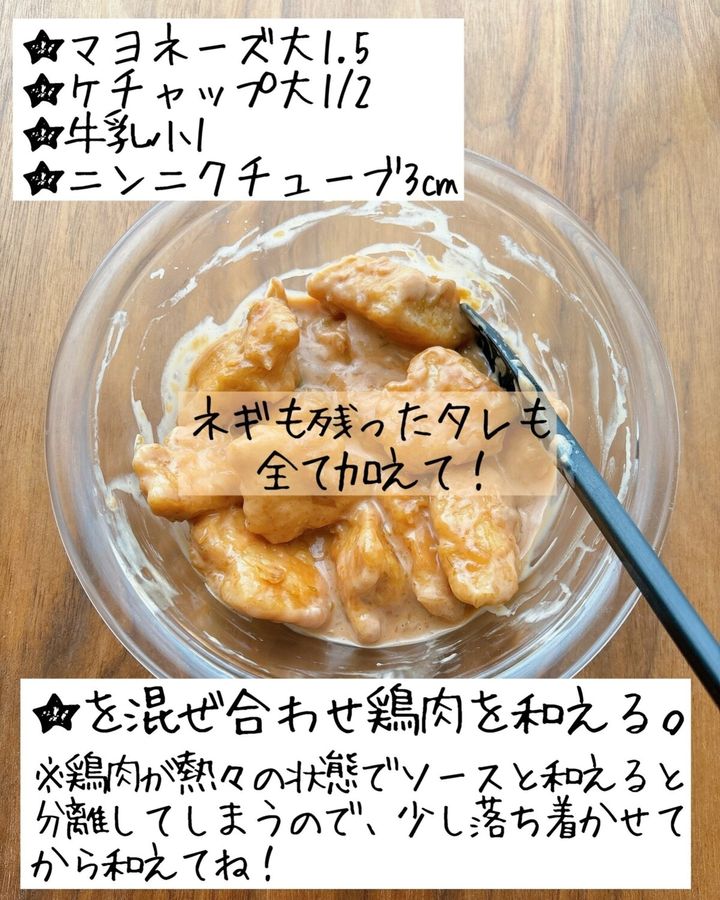 ★を混ぜ合わせて鶏肉を和える。鶏肉が熱々の状態でソースと和えると分離してしまうので、少し落ち着かせてから和えてください。