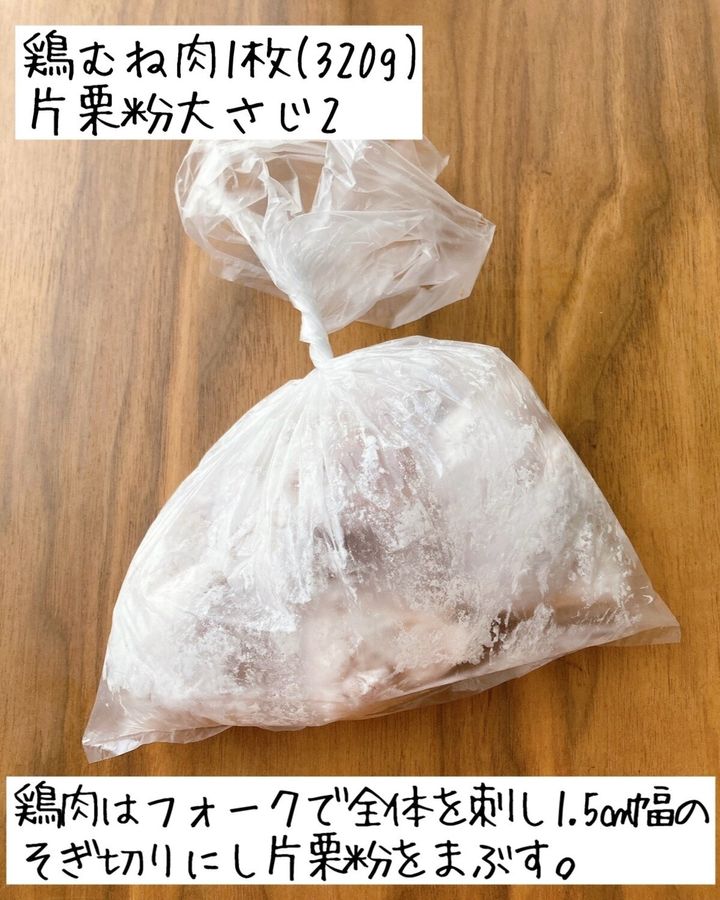 2.鶏むね肉を切り片栗粉をまぶす