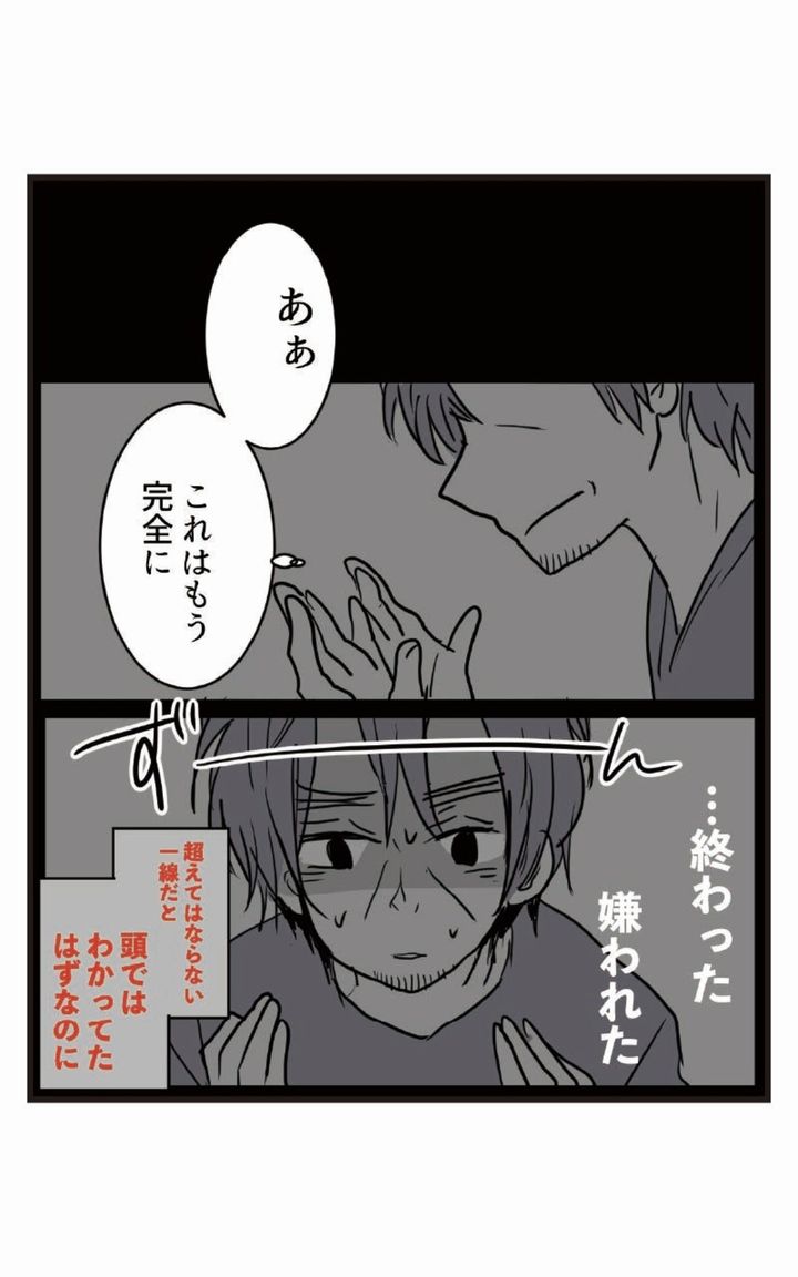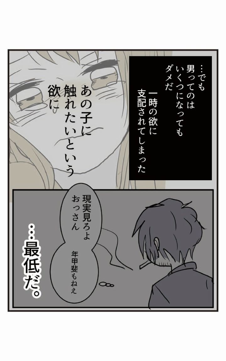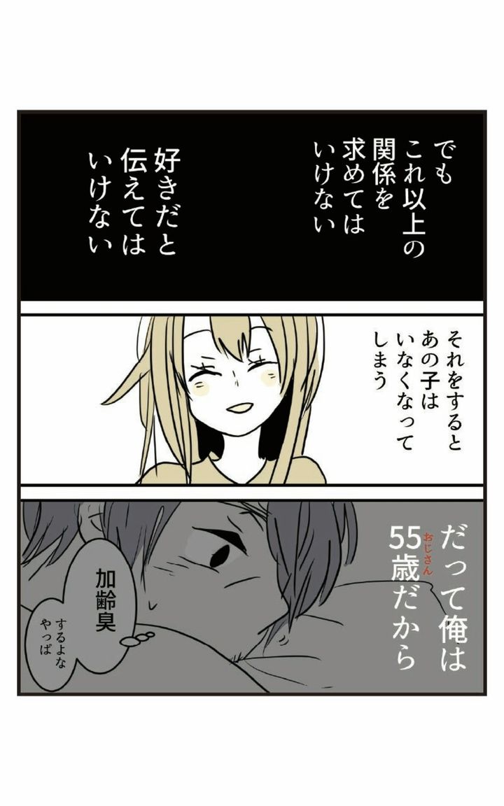 気持ちを抑えきれず、美咲さんにキスしてしまったことを後悔するおじさん。歳の差の問題と言うより、相手の合意なしに行為を始めてしまうのはいけないことです。お酒が入っていたとはいえ、美咲さんが受けたショックは大きかったでしょう。
