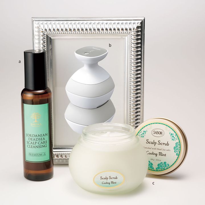 a.天然のミネラルバランスに優れたデッドシーウォーターを80%配合し、頭皮をディープクレンジングしてパワーチャージ。精油の香りも至福です。ジョルダニアンデッドシースカルプケアクレンジング 100ml ¥3,740(BARAKA)b.硬さの異なる3つのブラシがしっかり頭皮へアプローチ。頭皮エステ〈スパイラル&スライド〉 EH-HE0Jオープン価格(パナソニック)c.オーガニックミントと死海の塩でベタつく頭皮をクールにしつつ、サラサラな髪へ。SA BON ヘッドスクラブリフレッシング 300g¥5,390(SABON Japan)