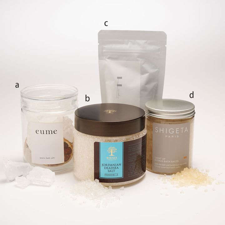 a.マグマの高熱によって固められた宝石のような人気のバスソルト。eumeクォーツバスソルトクリスタルレモン 400g ¥3,700(コスメキッチン)b.ヨルダン側にある死海の深層部より採取した天然100%の極上バスソルト。マグネシウムで疲れを癒やし、天然ミネラルが肌をなめらかに。ジョルダニアンデッドシーソルト 500g ¥4,950(BARAKA)c.シチリアの岩塩をベースに2種のクレイをブレンド。相乗効果で肌を潤しながらデトックスを叶えます。バスソルトローズ&イランイランの香り200g ¥2,530(エッフェオーガニック)d.レモンとレモングラスの心地よい香りとともに、しっとり肌へ導くミネラル豊富な死海の塩のバスソルト。ライトアップバスソルト 285g¥3,135(SHIGETA PARIS)