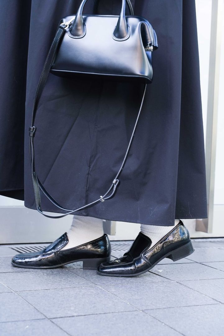 「コロンとした丸みがかわいいOSOIのバッグ。ボストンバッグのようなスクエアシルエットでほどよくモードな印象に。ハンドルで持っても、斜め掛けしても使えるのでシーンを問わずに使えるお気に入りです」OSOIのバッグは本人私物