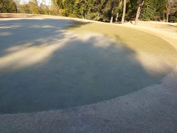 日が出て気温が上がってくると、凍っていたところが溶け出します。朝の内はボールに霜がついてしまって転がらなかったのに乾いて早くなったり、かちかちだったグリーンが溶けだしてグリーン上で止まるようになったり、時間や場所によって状況が大きく変わります。しかも、それは場所によってまちまち。朝すぐに日が当たる場所と、ずっと日陰の場所では明らかな差が。
