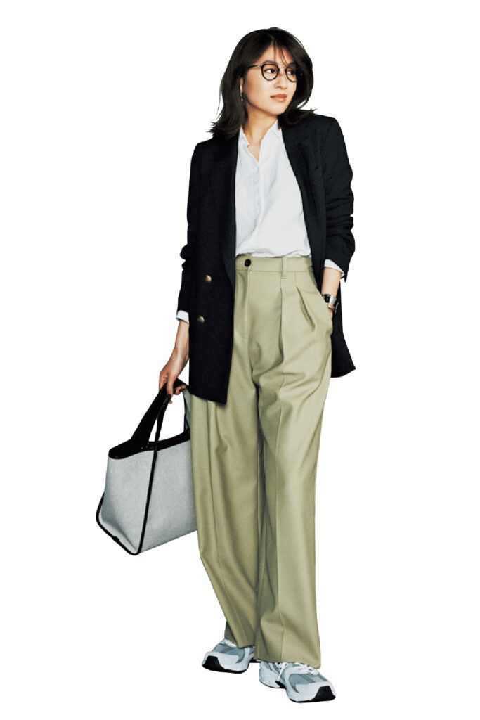 ジャケットは身幅が広いものをセレクトして。ジャケット¥23,100(カデュネ/カデュネ プレスルーム)シャツ¥23,100(マイカ アンド ディール/マイカ ア ンド ディール 恵比寿店)パンツ¥22,000(セテンス)バッグ¥40,700(FEEL AND TASTE /ショールーム セッション)スニーカー¥12,980(ニューバランス/ニューバランスジャパン お客様相談室)めがね¥52,800(アイヴァン/アイヴァン 東京ギャラリー)ピアス¥20,020(バルブス/ZUTTOHOLIC)バングル¥19,800(イン ムード/フォーティーン ショールーム)