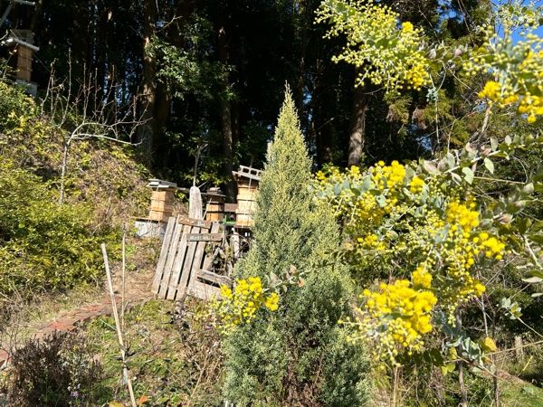 ミモザの奥にはミツバチの巣箱が。レッスンで使われる蜂蜜はこちらから収穫された自家製蜂蜜です。感激の連続です!
