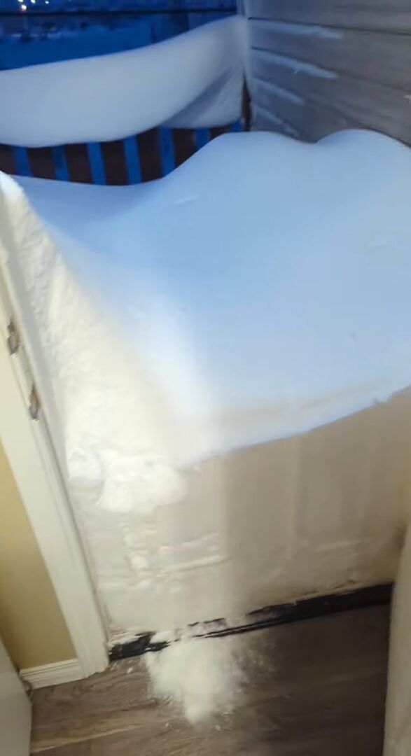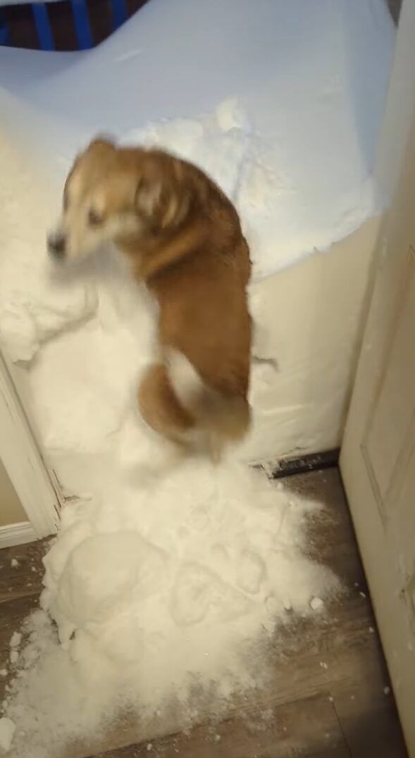 その勢いで、積もっていた雪は崩れ、一部は家の中に入ってきてしまっています。 愛犬は、積もっている雪を見て気分が高揚したのかもしれませんね。