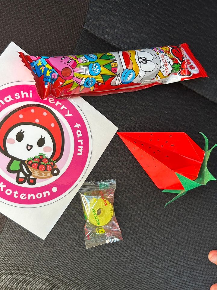 こてのんのステッカーとうまい棒といちごの折り紙。