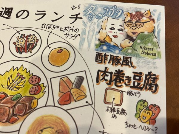 実はこのメニューには秘密が・・・。 メニューにはイラストが描いてあるのですが、このイラストはご主人の手描きだそうで、メニューに合わせたギャグが盛り込まれているんです!! この日のメニューは「酢豚風肉巻き豆腐」ということで、豆腐を包み込む豚の絵が! 某韓国ドラマがモチーフですね(笑)。
