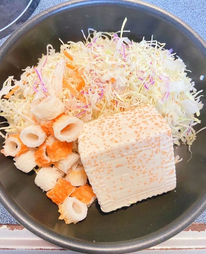 ①フライパンに豆腐、千切りキャベツ、手でちぎったちくわ、顆粒だしを入れ、手で混ぜる