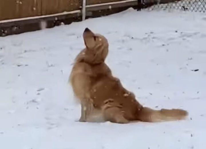 雪を見つめているゴールデンレトリバー、ずいぶん静かにしていると思ったら