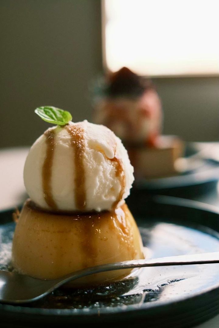 カラメルたっぷりのプリンの上にアイスが乗ったラッティエーラの看板メニューです🍮