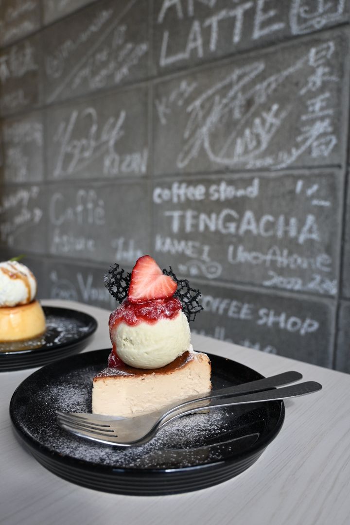 イチゴ味のバスクチーズケーキにピスタチオのアイスがのっています!