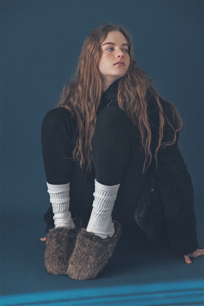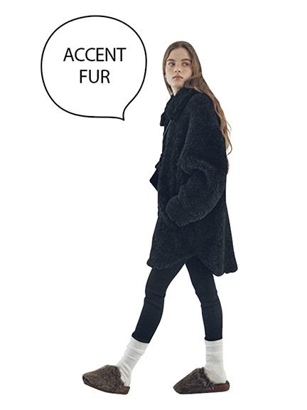 黒ボアコート 44,000円/Jakke、黒ショルダーバッグ 11,000円/BRIE LEON(ともにジャック・オブ・オール・トレーズ プレスルーム) 黒レギンスパンツ 20,900円/ATON(ATON AOYAMA) ソックス(6P) 3,960円/THE RAILROAD SOCK(メイデン・カンパニー) サンダル 19,800円/マリブサンダルズ(シードコーポレーション)