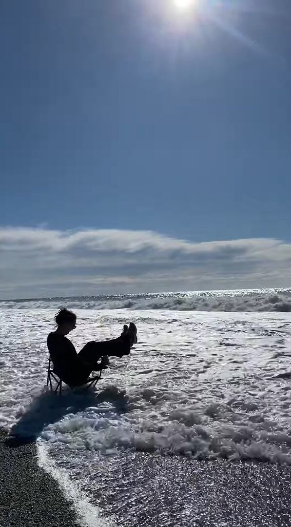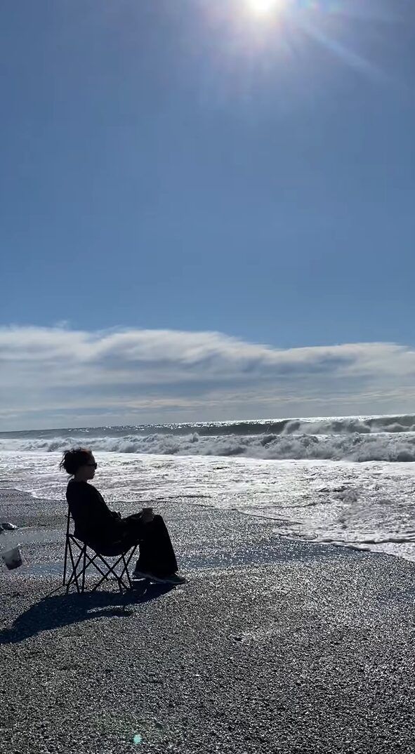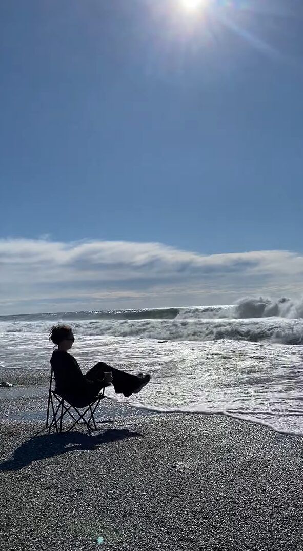 よく晴れたその日、女性は波打ち際に置いたキャンプチェアに腰かけてくつろごうとしていました。 海を独占するような楽しみ方です。
