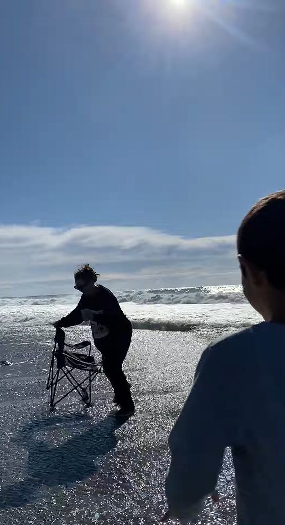 波打ち際にキャンプチェアを置いた女性。 優雅なひと時を過ごすのかと思いきや・・・