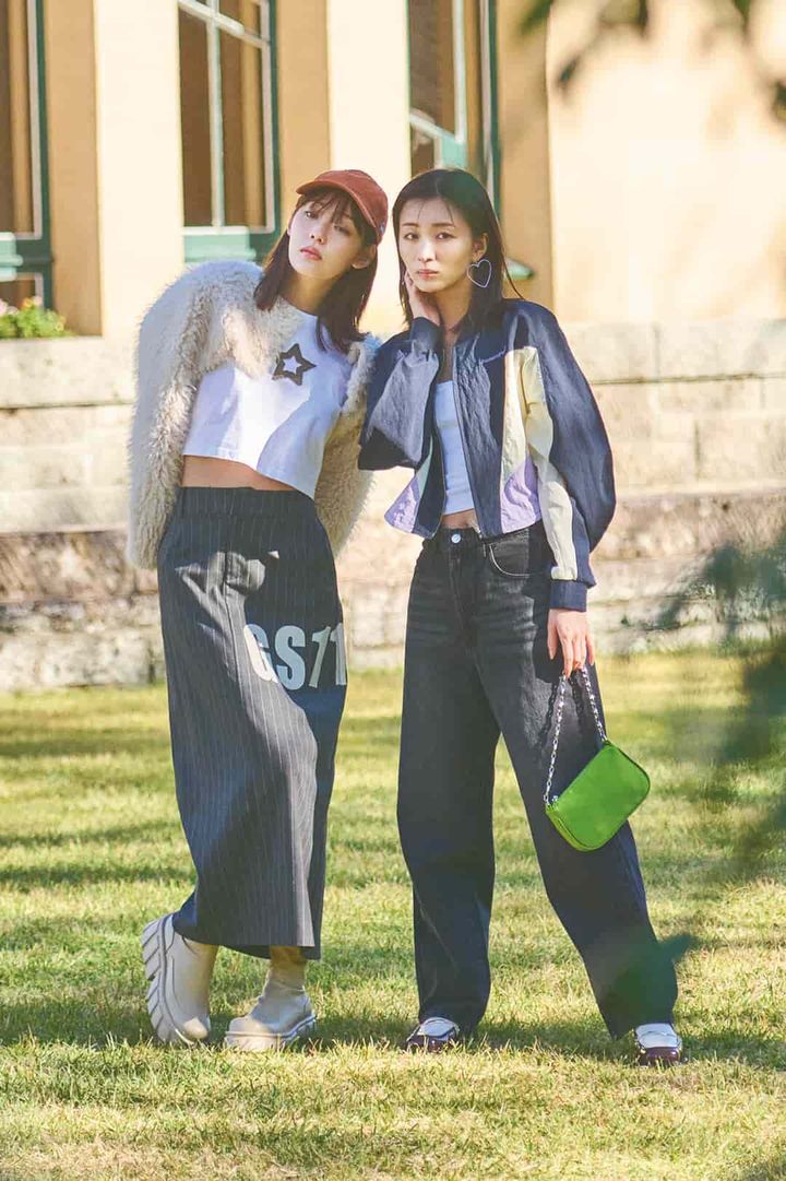 〈りほ〉ストライプロゴスカート 12,100円/ANNA SUI NYC、白スター Tシャツ 6,490円/atmos pink(ともにアトモス ピンク フラッグシップ 原宿) 白ファーボレロ 19,800円/DEICY(DEICY ルミネ新宿店) キャップ 4,400円/ニューエラ 厚底サイドゴアブーツ 13,900円/チャールズ&キース(チャールズ&キース ジャパン)〈さえ〉ブラックブルゾン 20,644円/INSTANTFUNK(MUSINSA GLOBAL STORE) 白タンクトップ 4,315円/ロサンゼルス アパレル(ロサンゼルス アパレル ジャパン) デニムパンツ 12,880円/épine イヤリング 550円/パリスキッズ 原宿店 バッグ 3,990円/MANGO(LOCONDO) ローファー 9,500円/チャールズ&キース(チャールズ&キースジャパン)