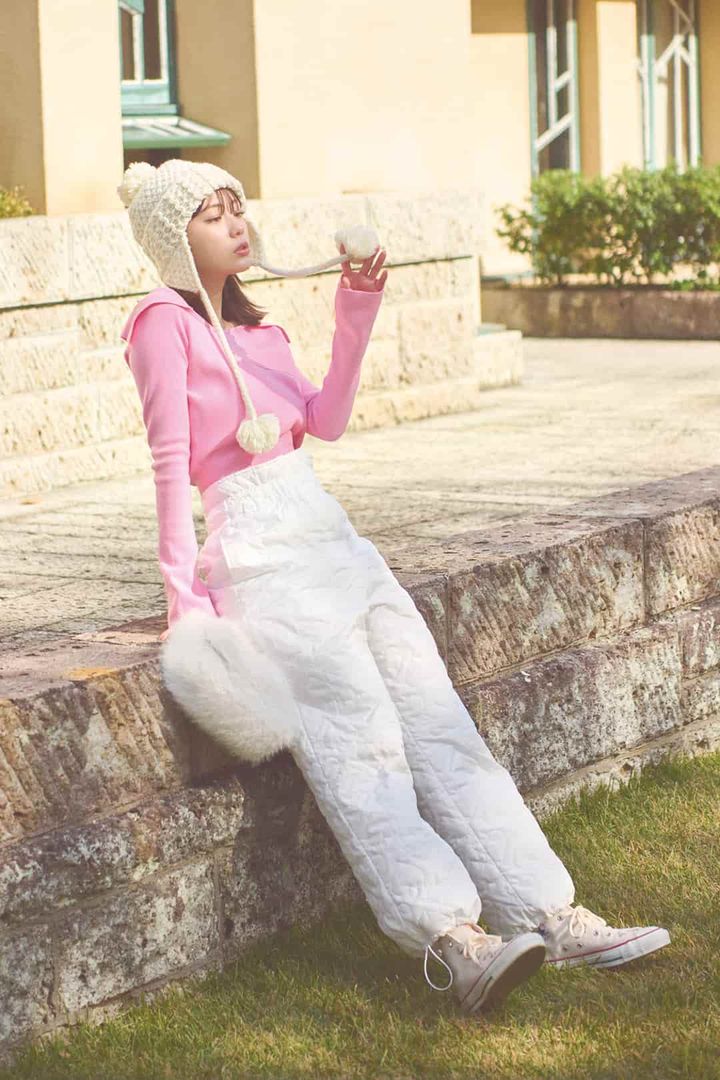 白ハートダウンパンツ 7,920円、白ニット帽 3,960円/ともにAlley by w closet(WEARS INC.) ピンクニット 14,634円/INSTANTFUNK(MUSINSA GLOBAL STORE) バッグ 3,299円/WEGO ハイカットスニーカー 14,300円/コンバース