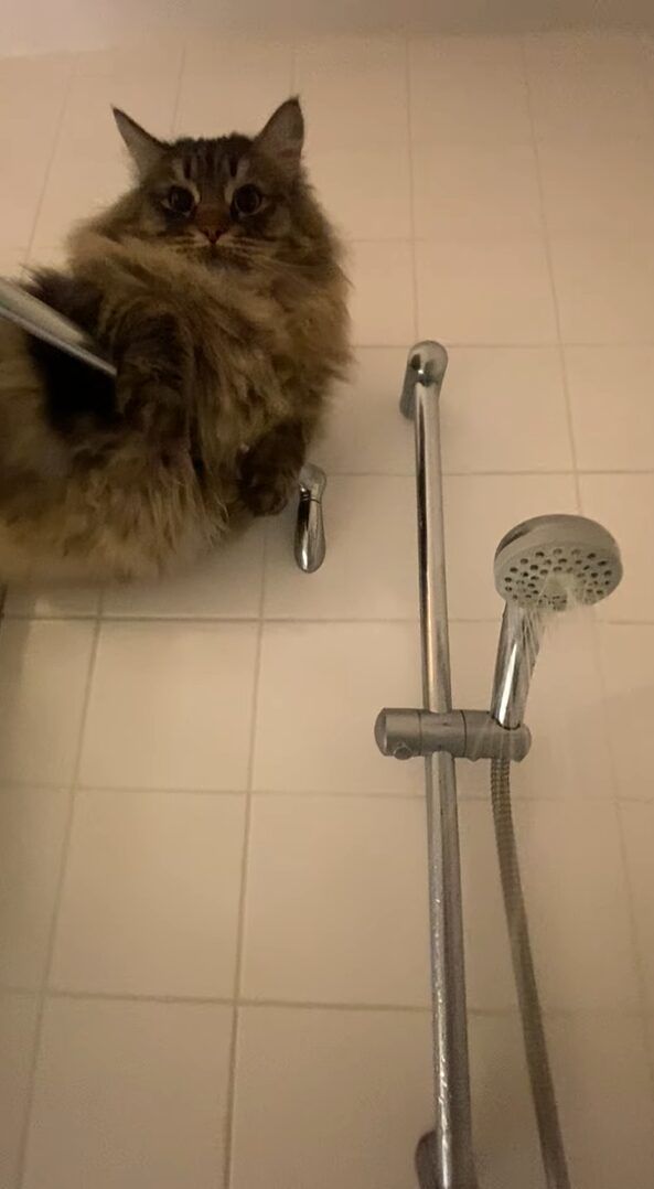 飼い主さんのことが大好きな愛猫は、シャワーの間もそばにいたかったようです。 シャワールームにいる飼い主さんは、どうやら視線を感じたみたい。
