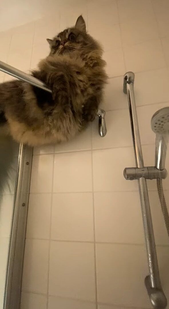 3. 飼い主さんがシャワーの間もそばにいたい猫。絶対濡れない最高のポジションを発見したみたい!!【海外・動画】