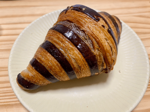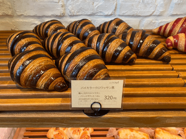 バイカラークロワッサン黒320円税込 店長おすすめの商品!甘さと香ばしさが絶秒にマッチ!27層で作りあげているとのことでサクサク感がたまりません。