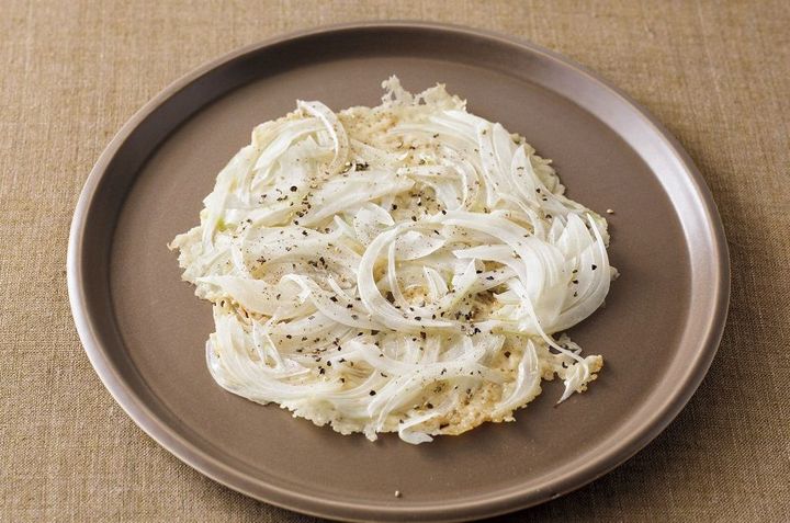 フライパンにチーズを直径15cmほどの円形に広げ、玉ねぎをのせて弱めの中火にかける。フライ返しで玉ねぎを押さえながら、チーズの周囲にかるく焼き色がつくまで4~5分焼き、バットに取り出してチーズが固まるまでさます。器に盛って、粗びき黒こしょう少々を散らす。