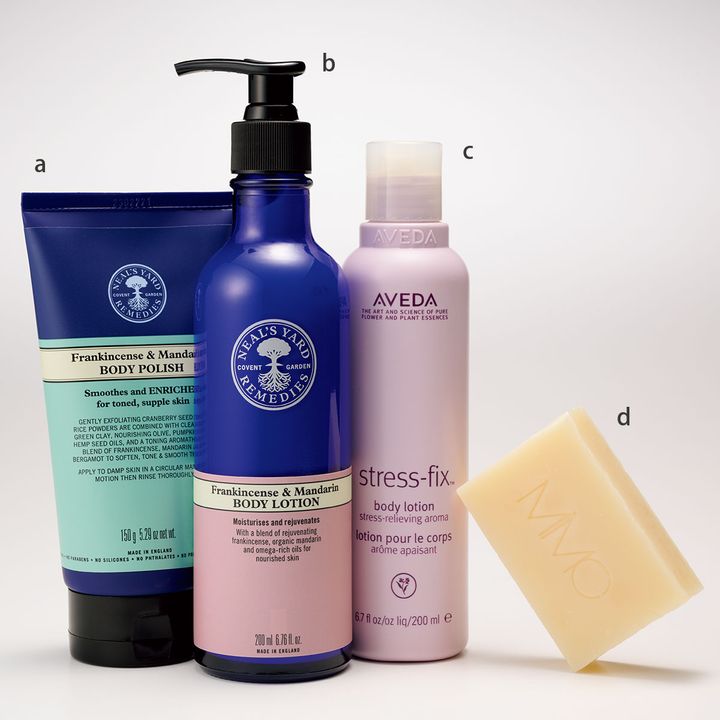 a.植物油を惜しみなく配合したボディ用スクラブ。フランキンセンス&マンダリンボディポリッシュ150g ¥5,280 b.ミルクのように軽やかな乳液タイプでハリのあるなめらかな肌へ。フランキンセンス&マンダリンボディローション 200ml ¥5,390(a、b ともにニールズヤードレメディーズ) c.ラベンダーやフランキンセンスなど緊張を緩めてくれる香りでケアを。ストレス フィックス シリーズ ラベンダーボ ディ ローション200ml ¥4,180(アヴェダ) d.肌が潤い心がほぐれる植物美容ソープ。オメガフレッシュモイストソープ(フランキンセンスブレンド)100g ¥3,080(MIMC)