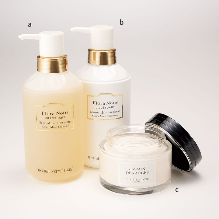 a.ダメージが気になる髪をしなやかに。フローラノーティス ジルスチュアート センシュアルジャスミン リペアモイストシャンプー 400ml ¥3,300 b.しっとりまとまりのある髪へ。フローラノーティス ジルスチュアート センシュアルジャスミン リペアモイストトリートメント 400ml ¥3,300(a、b ともにフローラノーティスジルスチュアート) c.肌に潤いを届けるボディクリーム。使用後の肌の香りが至福です。メゾン クリスチャン ディオール ジャスミン デ ザンジュ ボディクリーム 150ml ¥14,740(パルファン・クリスチャン・ディオール)