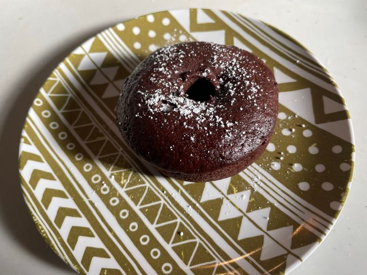 上記の材料を全てボウルに入れてよく混ぜます。ドーナツ型に生地を入れ、電子レンジ(600w)で3分加熱。粉糖まぶして完成!