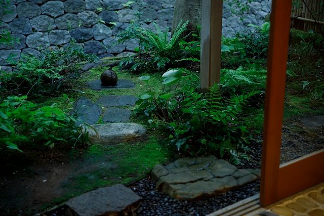 柿木畠(かきのきばたけ)にあるお店の空間は、金沢の職人が手がけています。裏手には辰巳用水(たつみようすい)が流れており、天気のよい日は庭へのガラス戸が開け放たれ、せせらぎの音が。店内から眺めることのできる手入れの行き届いた庭の先には、江戸時代に造られた金沢城の石垣が見え、春は桜、秋は紅葉と街中とは思えない四季折々の自然を感じることができます。