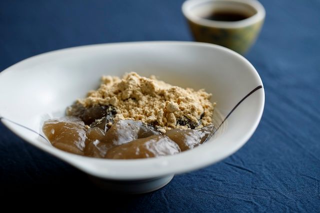 また、セットで付けられる香ばしい加賀棒茶は、甘味との相性が抜群。熊本産のわらび粉だけを使用した本わらびもちは、作りたてが提供されるためほんのり温かいのが特徴です。ふるふるとみずみずしく、ねっとり粘度があって滋味があり、自然な甘さが舌の上で広がります。こだわりのきな粉の濃い風味と特製黒蜜のコクのある甘さが調和します。
