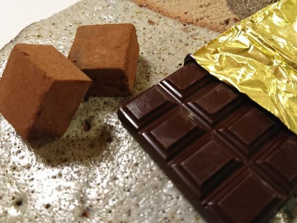 生チョコレート(タンザニア)はリンゴやブドウのような酸味とワイニーな風味ビーントゥバーチョコレート(ホンジュラス)はストロングでビターなカカオ感の後にナッツテイスト感