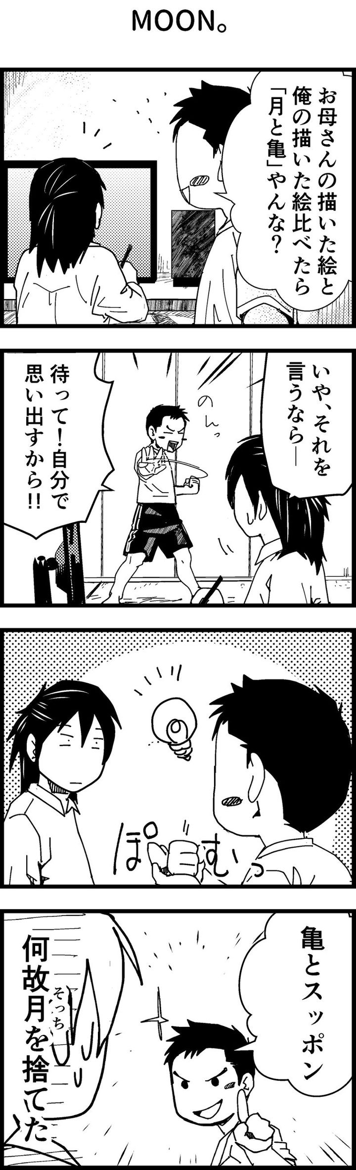 絵描きを専業としているはるたけめぐみさんに、タロウくんが掛けた言葉は「お母さんの描いた絵と俺の描いた絵を比べたら『月と亀』やんな?」というもの。直後、「月と亀」のことわざが間違っていることに2人は気付きます。