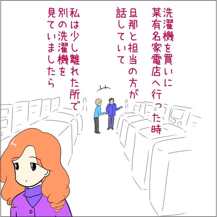 ご主人と一緒に、家電量販店へ洗濯機を選びに来た女性。ご主人と店員が話している中、女性は少し離れた場所で他の洗濯機を見ていたそうです。