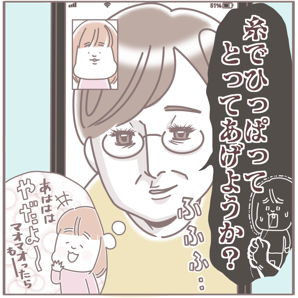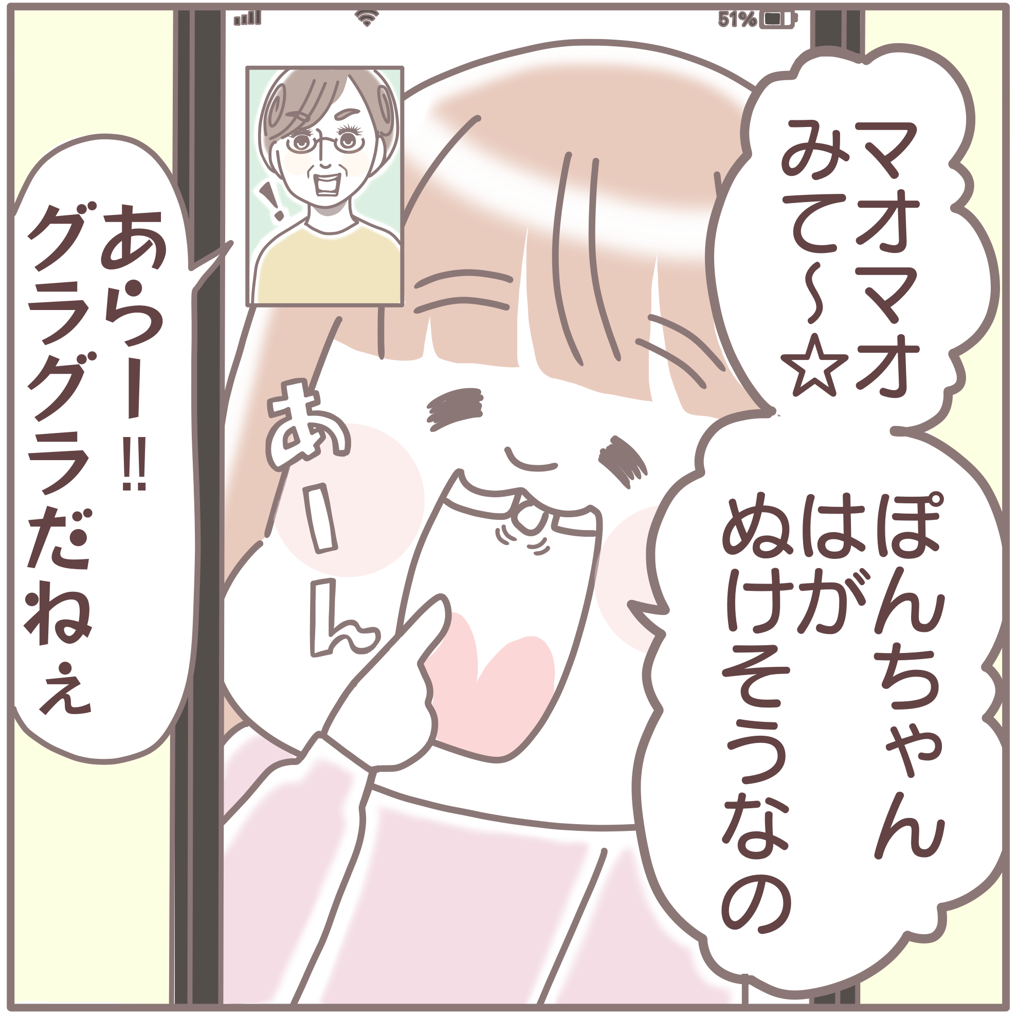 「ぽんちゃんはがぬけそうなの」と、今にも抜けそうな歯を見せてくれるぽんちゃん。「糸でひっぱってとってあげようか?」と祖母が脅かしますが、「もう…そういう『じだい』じゃない」と、容易く論破されてしまうのでした。