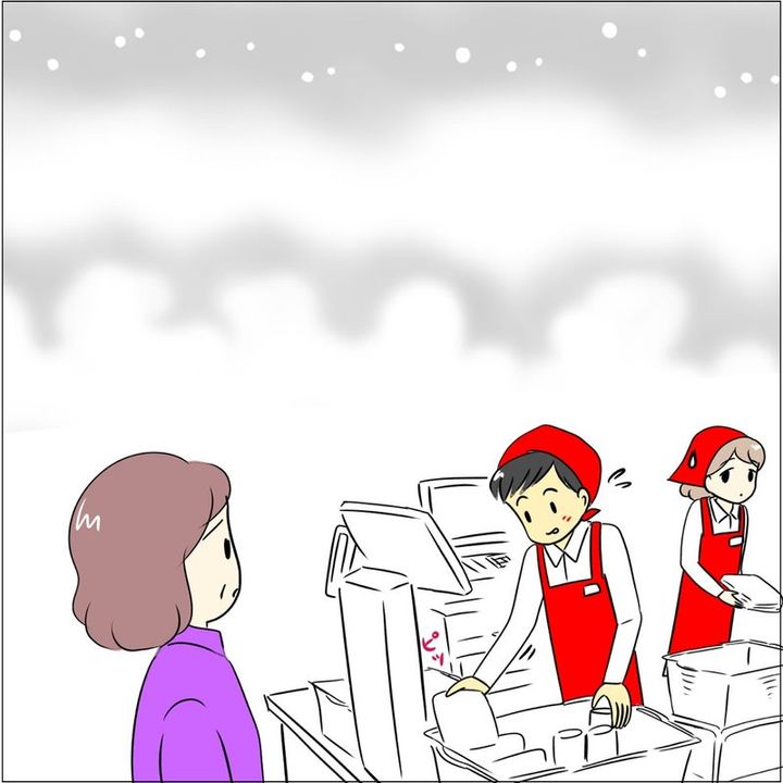 くしゃみを押さえた手を拭かず、そのままレジ打ちを続けたアルバイトスタッフ。咄嗟のことで、きっと動揺していたのでしょう。そんなアルバイトスタッフを咎めるわけでもなく、ポケットティッシュを渡してくれた女性のやさしさが伝わってきます。
