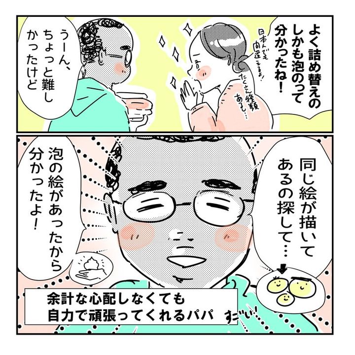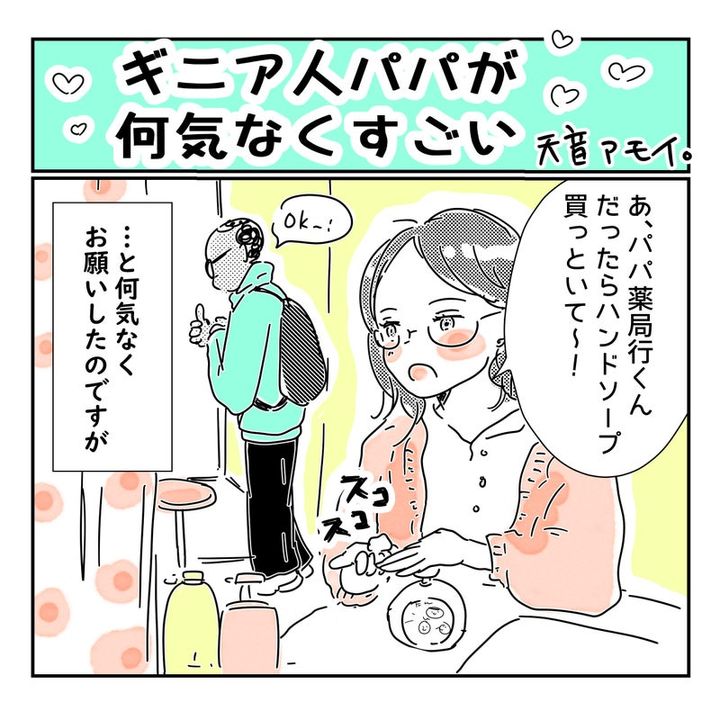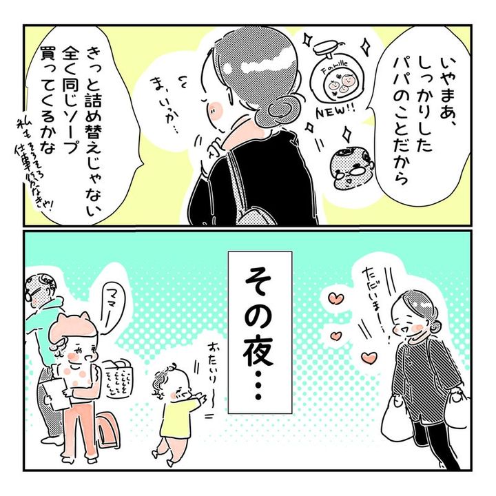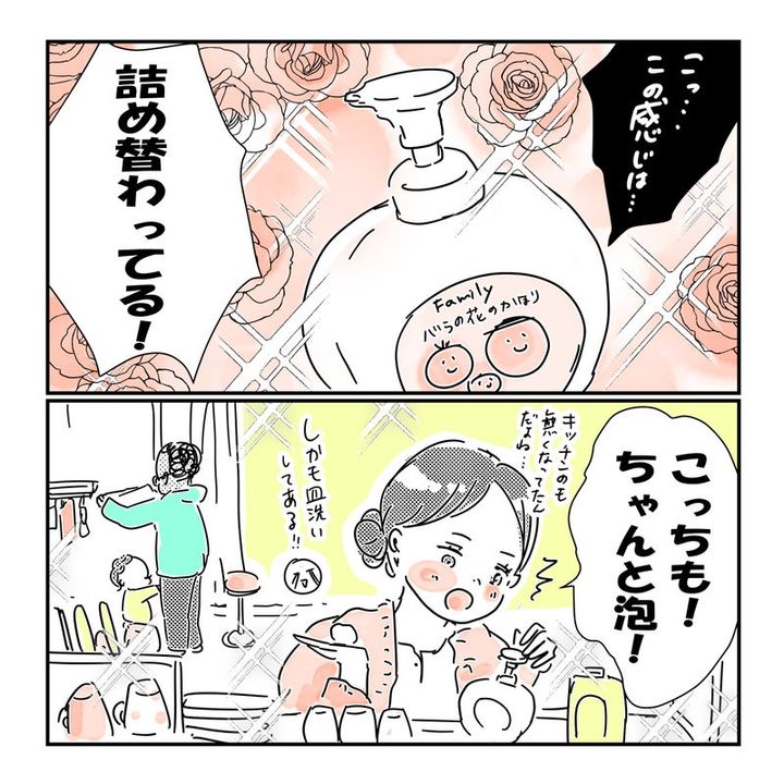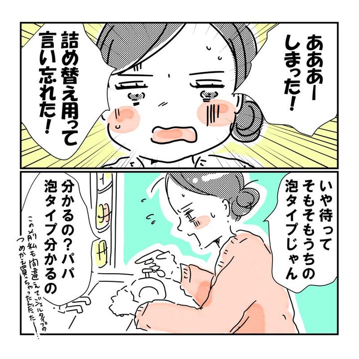 薬局に行くウメルさんにハンドソープを買うよう頼みますが、詰め替え用であることや、泡タイプであることを伝え忘れてしまいます。しかし、ウメルさんは、詰め替え用の泡タイプをしっかり購入してきたうえ、詰め替え作業や皿洗いまでやってくれていたのでした。