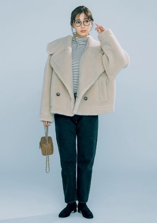 ボアショートコート¥46,200/ルーニィボーダー ニット¥5,990/アンフィーロ、デニムパンツ¥16,940/アンクレイヴ ホワイト(ともにオンワード樫山) イヤリング¥9,900/エンジュ ジュエリー(フォーティーン ショールーム) メガネ¥12,000/OWNDAYS バッグ¥2,990/神戸レタス ショートブーツ¥25,300/ダイアナ(ダイアナ 銀座本店)