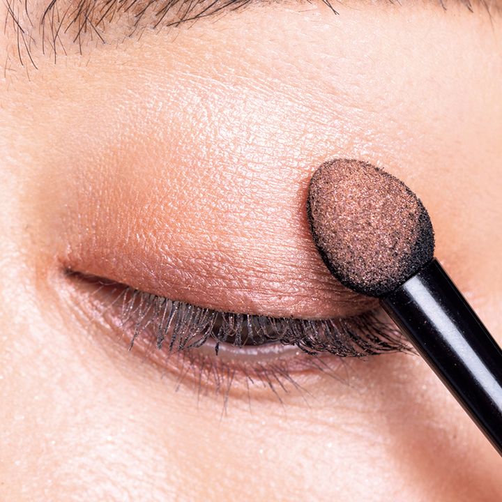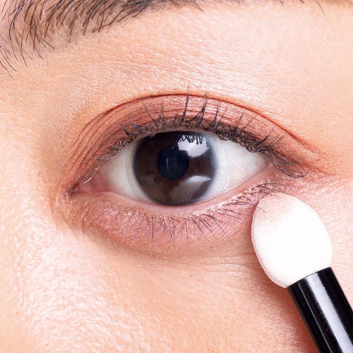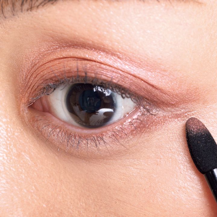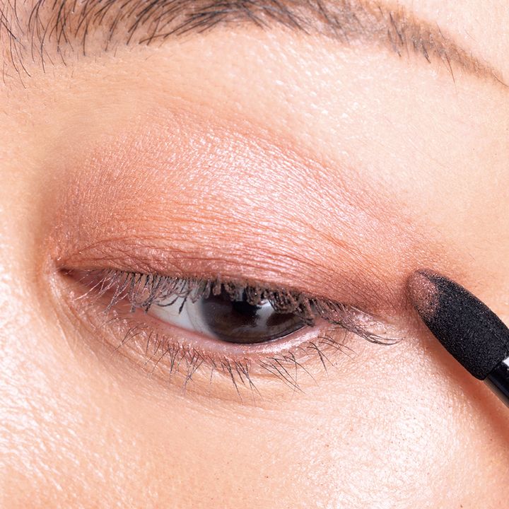3をアイホール全体に塗布。指づけでもOK。4をチップに取り黒目の位置を頂にして、目頭から目尻へと山を描くようにのせて。