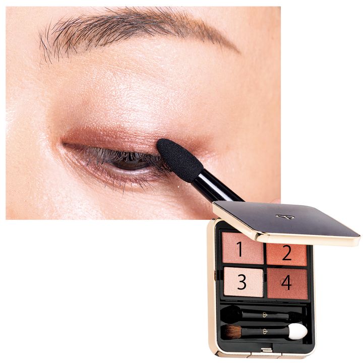 肌馴染みの良い血色カラーの1を目の下全体に。4を黒目の下の部分のみにオン。目の縦幅が広がり、黒目がちな眼差しを叶えます。