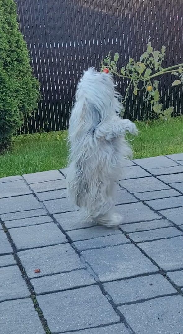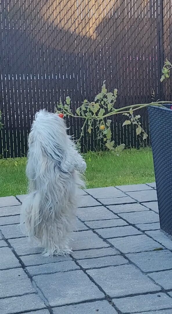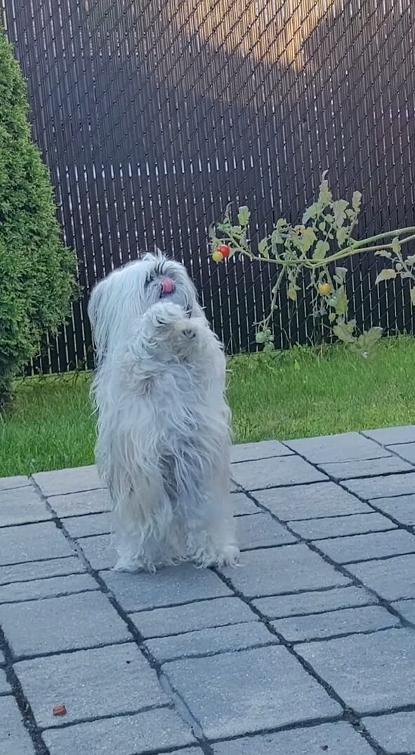 赤い実をつけるトマトの近くには、白いモップのようなモフモフの犬の姿があります。 この子は、後ろ足で立ち上がりトマトをじっと見ています!!