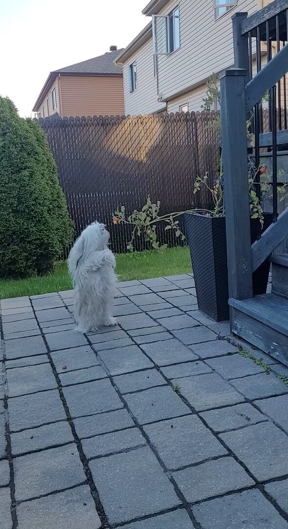 気になり過ぎて立ち上がった?トマトの苗木を見つめる犬【海外・動画】