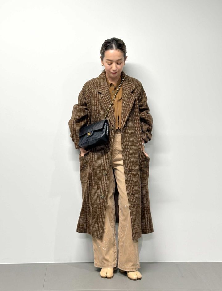 フリンジシャツ×ペイント加工のパンツと、一見個性的なアイテム同士の組み合わせながら、トラッドなヴィンテージコート&バッグでグッとこなれたムードに。