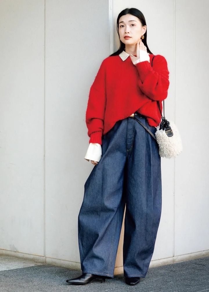 鮮やかな赤いニットをアクセントにしたカジュアルスタイルは大人が着るからこそいい! ボリュームデニムやモチーフ付きベルトなど、トレンドを意識したアイテムを合わせることが洒落見えのコツ。