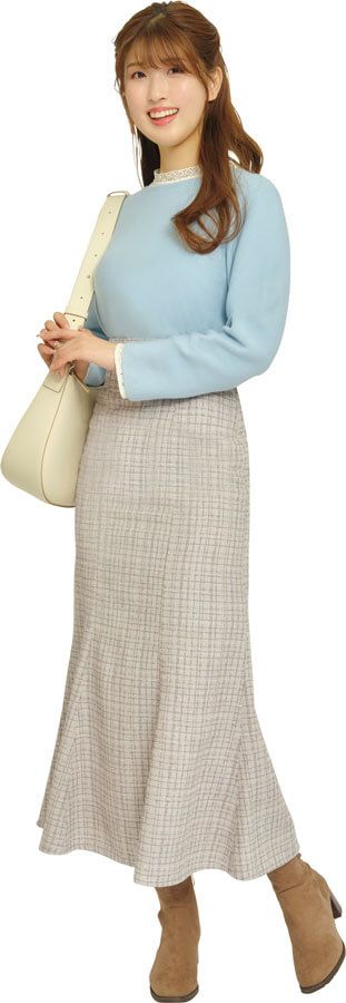 ユニクロは色出しが素敵なので、トレンドカラーや季節感のある色をセレクト。明るいブルーは春まで着られそう♪ 3Dニットはシルエットがきれいなのでさらに高見え。ラメ入りツイードのスカートはファスナーと幅狭めのゴムのダブル仕様。