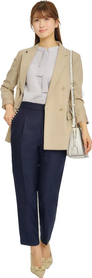 きちんと感を大事にしたいお仕事ジャケットは素材がしっかりしているユニクロが間違いない! ポケットのパール使いとテーパードシルエットの美しさが優秀なパンツはロペピクニック。タックとセンタープレスが入っていて、きちんと見えもばっちり。