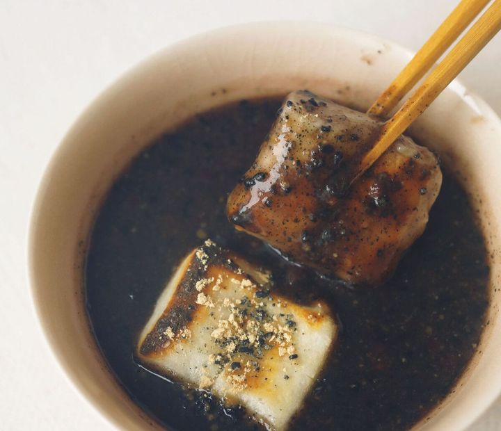 でき上がったあんこの鍋に、黒すりごま大さじ2を加えてよく混ぜます。器に盛ってもちをのせ、さらに好みで黒すりごま、きな粉各適宜をふったら完成!もちにごまあんをたっぷりからめてめしあがれ。