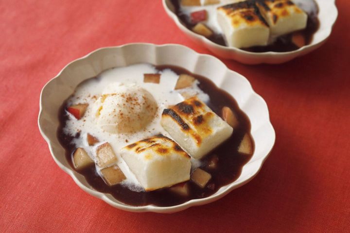 鍋にゆであずき、水、皮ごと1cm角に切ったりんご1/4個分を入れたら、中火にかけてひと煮立ちさせます。弱火にして2~3分煮たら、器に盛って、焼いたもちをオン。