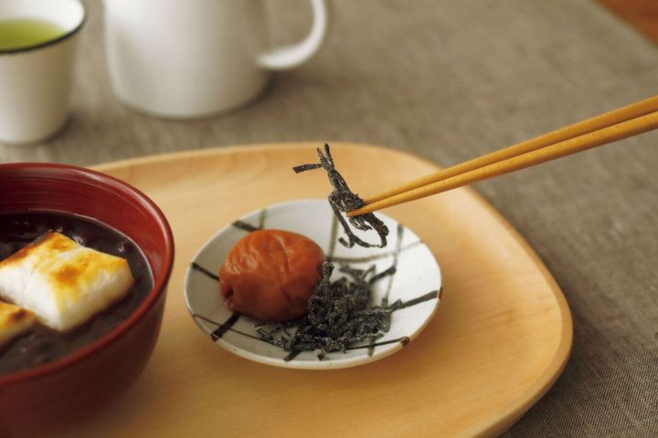 塩昆布や梅干しをちょっぴり添えると「甘味処」のメニューみたい! 塩けの強いものと食べることで、ぜんざいの甘みが際立ち、口直しになるので最後まで飽きずに食べられます。