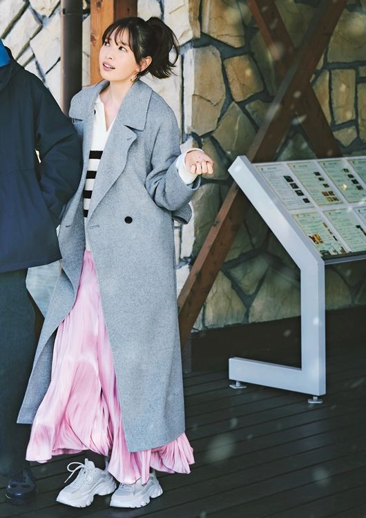 ウールコート¥29,000/PLST、ボーダースキッパーニット¥2,490/GU、サテンスカート¥17,600/リランドチュール、スニーカー¥8,800/ORTR( ダブルエー)、フープピアス¥1,760/スリーフォータイム(ジオン商事)、チャコールグレータイツ¥1,650/靴下屋(タビオ)